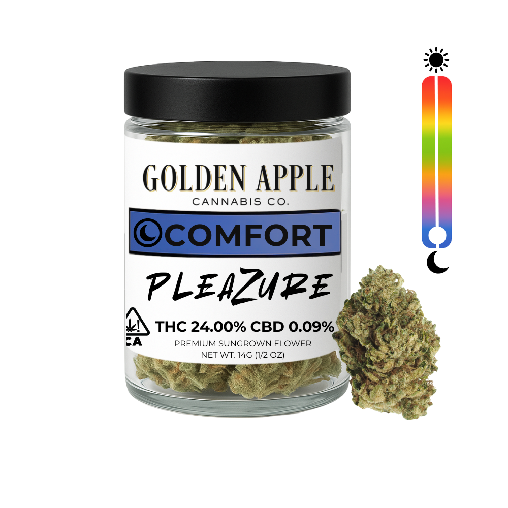 Pleazure is a deeply grounding cultivar designed for rest and recovery. It brings a full-body calm that gently shuts down the day, helping you release tension and sink into ease. Subtle floral and citrus notes keep the experience smooth and pleasant, while its steady body effect makes it a natural choice for winding down and preparing for restorative sleep. Cultivated by: Sweet Sisters Family Farm. Cannabinoids: THC: 24.00% | CBD: 0.09%